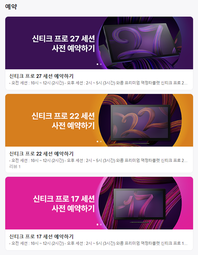 와콤 아트 스테이션은 네이버 예약 시스템으로만 참여가 가능한데요. 네이버 사전 예약, 당일 예약의 경우 세션 3시간 전까지 예약 후 예약 확정 안내를 받으셔야 참여할 수 있습니다. 현장 방문 예약은 불가하다는 점 꼭 기억해 주세요. 프로페셔널을 위한 와콤의 프리미엄 액정 타블렛 신티크 프로 17, 22, 27 중 하나의 모델을 선택해 오전 세션(10시~12시), 오후 세션(14시~17시)까지 사용 가능합니다.