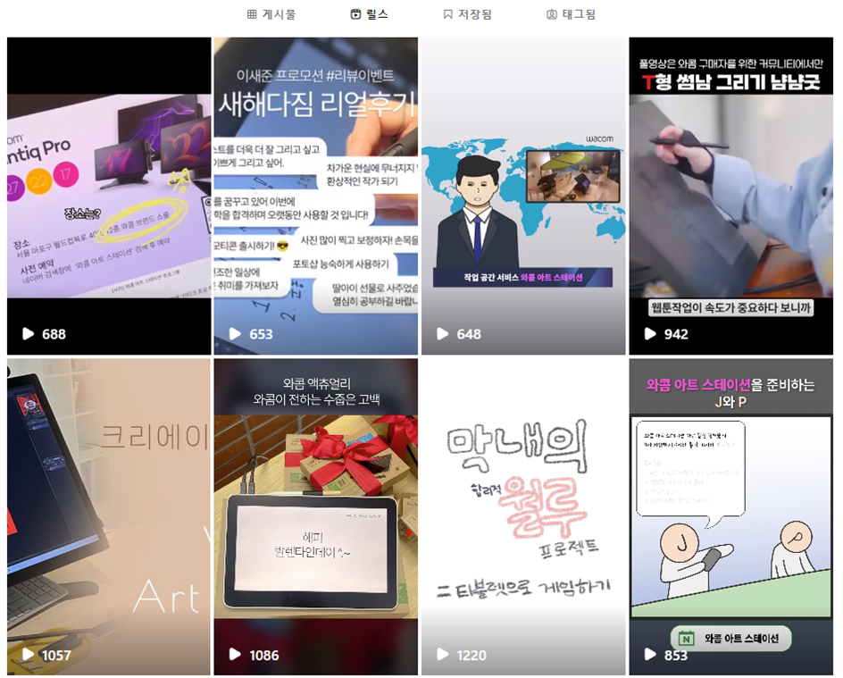 와콤 역시 공식 유튜브 및 인스타그램을 통해 다양한 숏폼 콘텐츠를 선보이고 있습니다. 와콤의 신제품 출시 소식부터 타블렛 이용법, 웹툰 튜토리얼, 프로모션, 이벤트 등 크고 작은 다양한 소식을 숏폼 콘텐츠로 제작하고 있답니다. 최근에는 와콤 브랜드 쇼룸에서 진행 중인 와콤 아트 스테이션과 관련한 다양한 콘텐츠, 와콤X케나즈 웹툰 튜토리얼의 마지막 에피소드, 타블렛으로 게임하는 와콤 막내 직원의 근무 일상을 보여주는 콘텐츠 등 흥미로운 콘텐츠가 많이 업로드 됐는데요. 그중 역시 숏폼 콘텐츠답게 짧지만, 유머와 공감 포인트가 가득한 타블렛으로 게임하는 와콤 막내 직원의 근무 일상 콘텐츠가 가장 인기 있네요.
