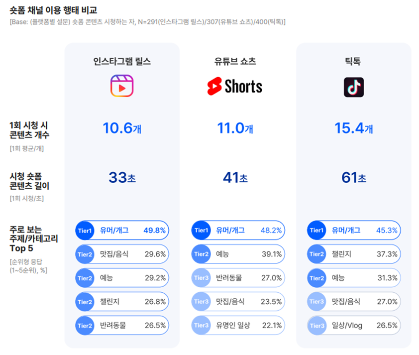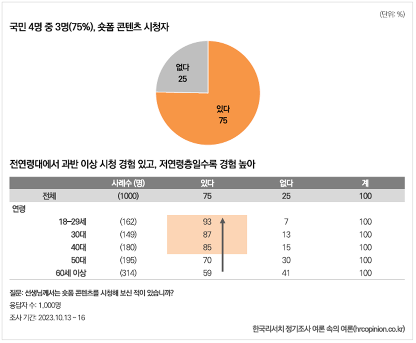 숏폼 콘텐츠의 대표적인 플랫폼으로 10대들이 많이 사용하는 틱톡, 알고리즘에 따라 시청 연령이 다양한 유튜브 숏츠, 20~30대 사용자가 많은 인스타그램 릴스가 있습니다. 지난 12월 한국리서치의 ‘숏폼 콘텐츠 이용 현황과 인식 그리고 규제 필요성’ 조사에 의하면 응답자 10명 중 8명 이상(83%)이 숏폼 콘텐츠를 알고 있으며, 7명 이상(75%)은 숏폼 영상을 시청한 적이 있다고 응답했습니다. 또 전연령층의 과반 이상이 숏폼 시청 경험이 있으며, 저연령층일수록 숏폼 콘텐츠를 소비한 경험이 많은 것으로 나타났습니다.