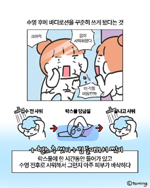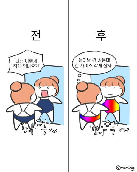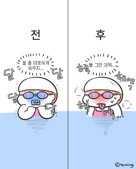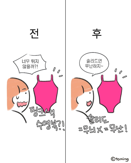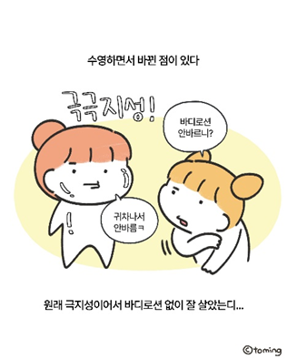 인스타툰이란 ‘전환점’ 이다. 사실 처음에 제가 인스타툰을 시작한 이유는 처음 출시한 자매 컨셉 이모티콘을 홍보하기 위해서였어요. 그래서 그 때는 언니와 동생의 이야기를 주로 그렸었죠. 그러던 도중 갑자기 수영을 시작하고, 수영에 푹 빠져서 수영에 관련된 만화를 그리게 됐어요. 그러면서 계정이 커지고, 광고나 공구 등 다양한 협업을 할 수 있게 되었죠. 인스타툰을 시작하기 이전에는 내가 이런 다양한 경험을 할 수 있을지 상상도 하지 못했던 터라, ‘전환점’이라고 하고 싶네요.