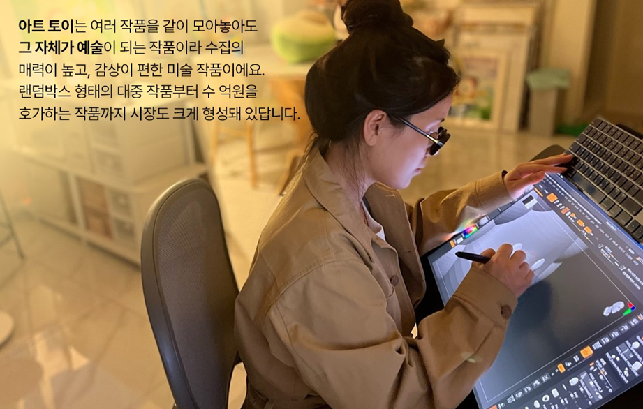 그림보다 공간은 덜 차지하고 만질 수 있는 작품인 아트토이는 여러 작품들을 같이 모아놓아도 그 자체가 예술이 되는 작품이라서 수집의 매력이 높고 더욱 감상이 편한 미술작품이라고 생각합니다. 그래서 간혹 아트토이를 수집해보지 않으신 분들이 ‘이 건 어디에 쓰는 거에요?’라고 물어보시는 경우가 있는데, 일상을 풍요롭게 해주고 심신의 안정을 준다고 답변해 드리기도 합니다.J 또 토이를 수집하는 분들은 여러 작가의 토이를 수집하는 것과 동시에 한 작가의 일대기를 쭉 모으시는 분들도 정말 많아요. 그래서 제 초창기 작업부터 소장하신 분들이 더 잘 알아 봐주시고 응원해 주시는 분들이 많은 것 같습니다.