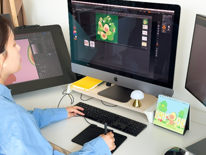 이렇게 캐릭터들이 만들어진 후 과일과 채소에 붙어있는 ‘스티커’를 소재로 컨셉을 입혀 세계관을 만들어 나갔습니다. 처음에는 포토샵과 일러스트레이터 툴이 가장 익숙해서 심플한 디자인의 캐릭터가 탄생하게 되었는데, 현재는 더욱 다양한 방식으로 스타일을 연구하고 개발하고 있어요.