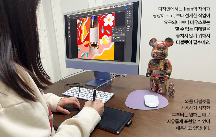 그런데 웬걸 사용해 보니 정말 편리한 거예요. 마우스로 과제 할 때는 제가 원하는 대로 디자인하기 쉽지 않아 답답했는데요. 와콤 타블렛은 일러스트 할 때 뿐만 아니라 사진 수정과 전반적인 디자인까지 세세한 부분을 편리하게 작업할 수 있어서 유용하게 사용하고 있어요. 지금은 갖고 다니기 편한 펜 타블렛 제품으로 디자인 미팅, 수업할 때 사용하고 있고요. 이제 와콤 타블렛은 저에게 있어서 없어서는 안 될 존재가 됐답니다.
