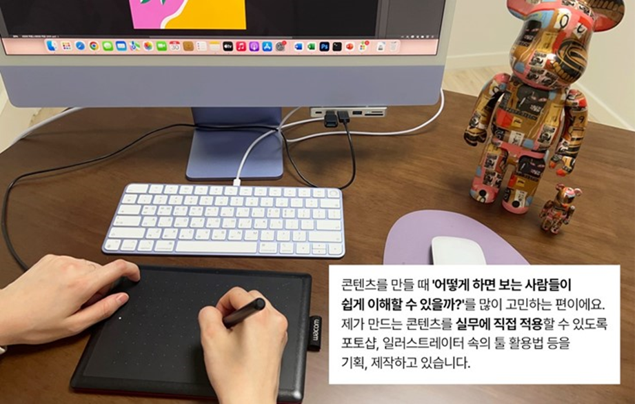특히 창작 입문자를 대상으로 강의할 때 와콤 타블렛은 더욱 빛을 발하는데요. 타블렛을 처음 사용해 보는 학생분들이 펜 타블렛 적응기를 거치고 나면 대부분 흰 도화지에 펜으로 그림을 그리듯 훨씬 쉽고 빠르게 작업물을 완성하고 계세요. 마우스로 디자인 및 일러스트 작업을 하는 것보다 훨씬 멋진 작업물들이 탄생하고요. 강사 입장에서도 수업할 때 모니터를 보고 중요한 부분을 강조하거나 필기할 때 아주 유용하게 사용하고 있어요.