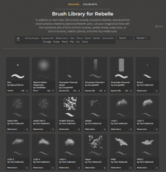 리벨레 7은 일본 화지, 린넨 캔버스, 석판화 돌 등 다양한 질감의 종이 캔버스를 제공하고 있습니다. 이와 더불어 이미 포함된 250개 이상의 브러시 외에도 프로그램 사용자들이 개발한 무료 브러시와 연필 및 펜 도구를 활용해 작품 활동을 할 수 있습니다.
