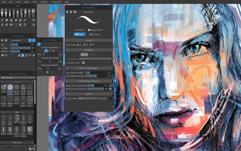 리벨레 7은 일본 화지, 린넨 캔버스, 석판화 돌 등 다양한 질감의 종이 캔버스를 제공하고 있습니다. 이와 더불어 이미 포함된 250개 이상의 브러시 외에도 프로그램 사용자들이 개발한 무료 브러시와 연필 및 펜 도구를 활용해 작품 활동을 할 수 있습니다.