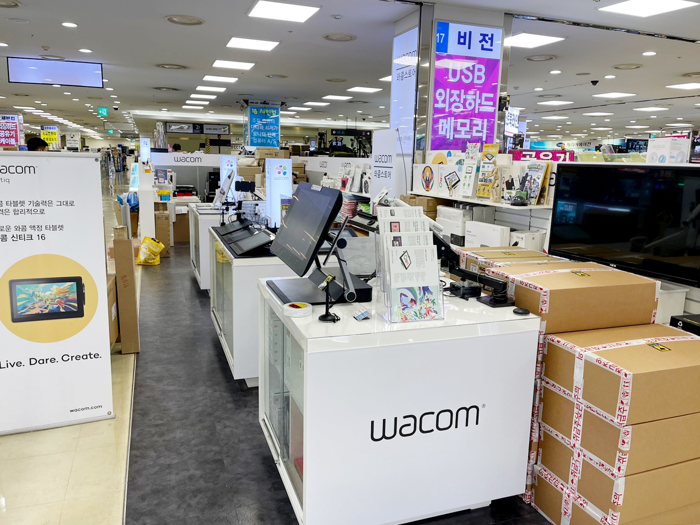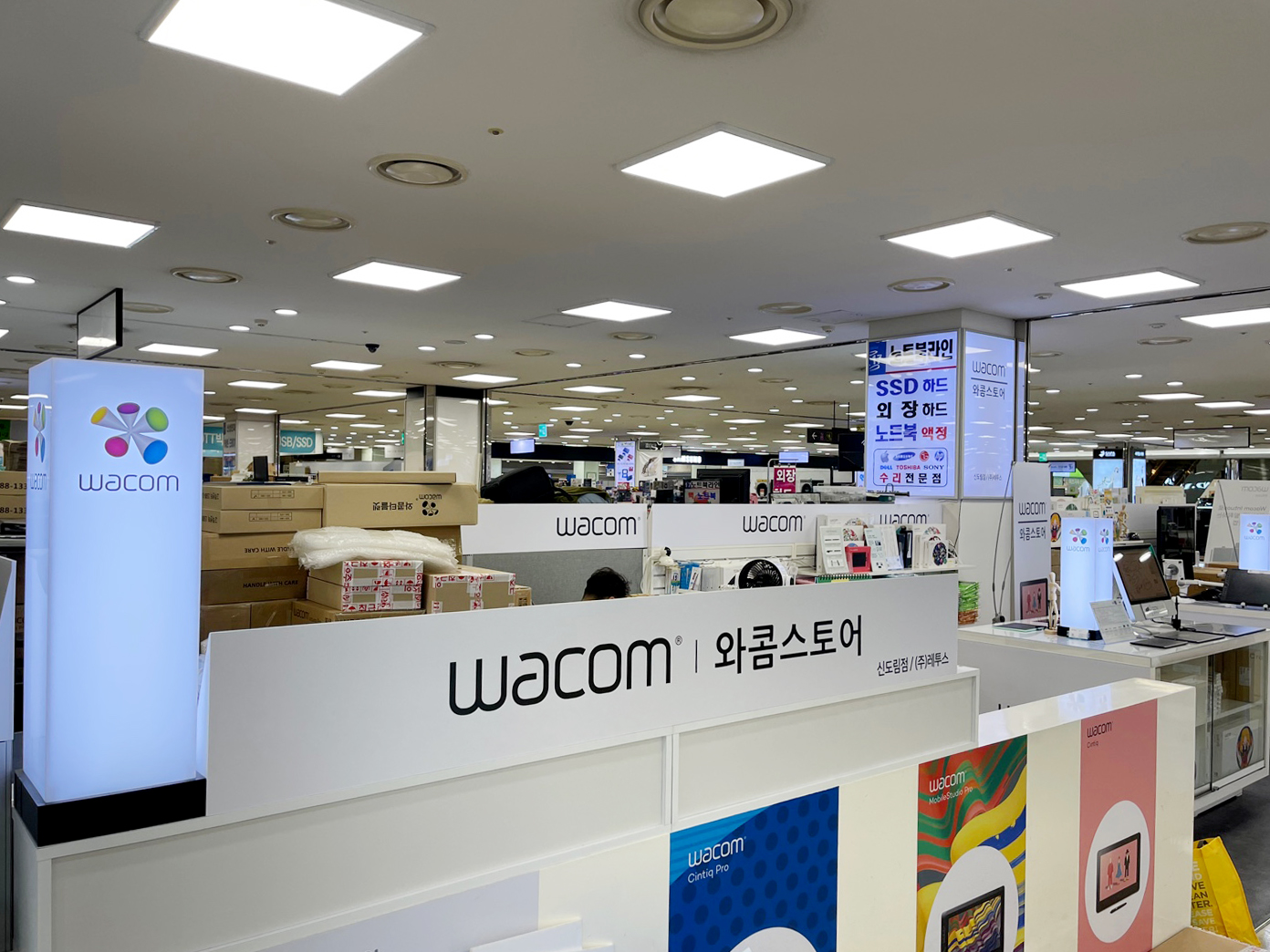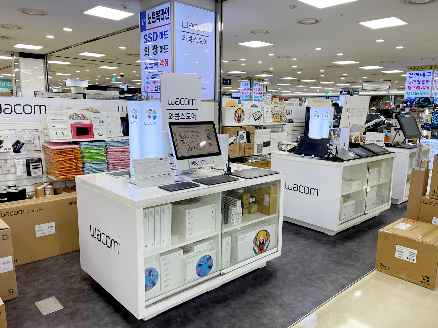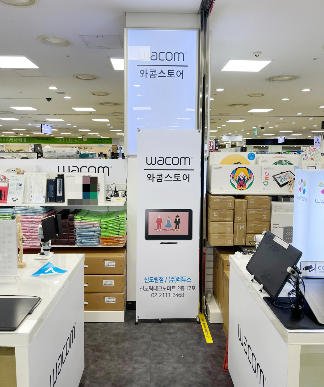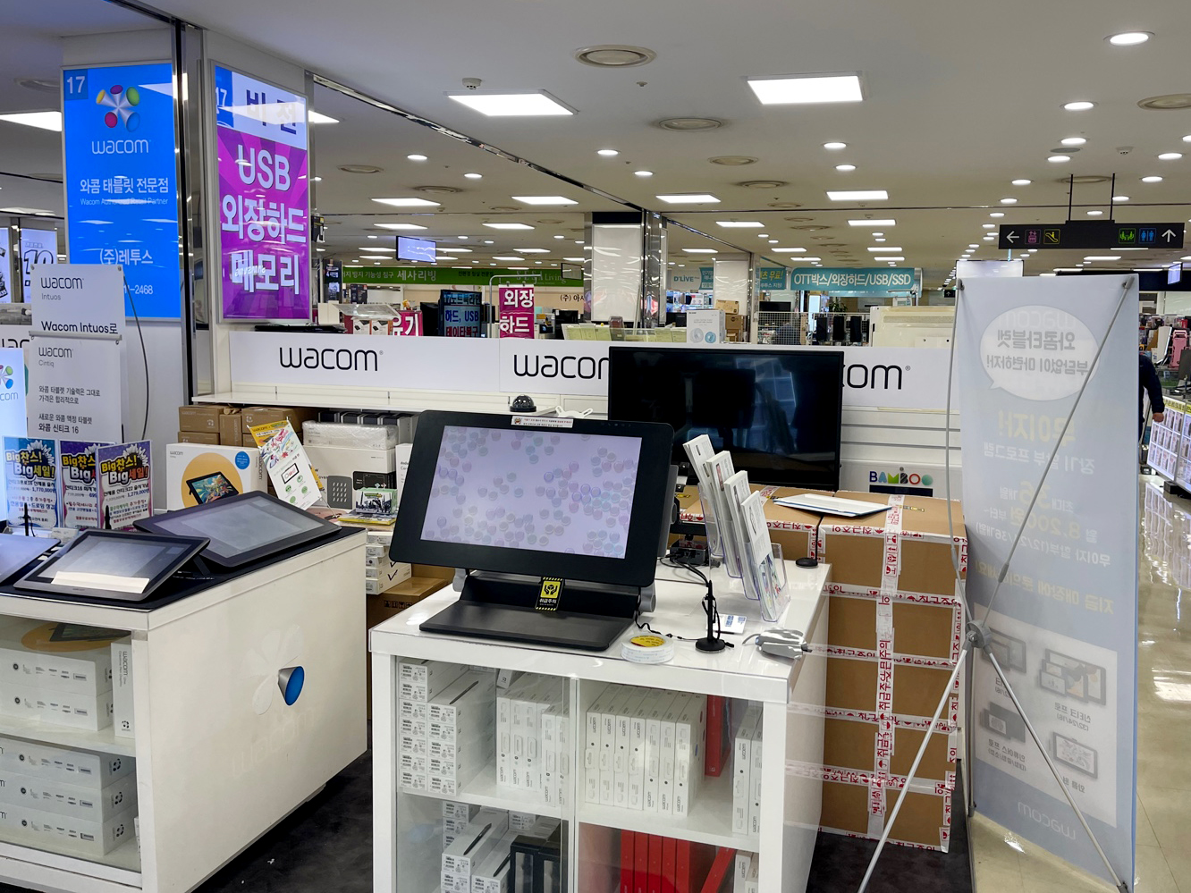 신도림 테크노마트 2층 17호에 오시면 와콤스토어가 바로 보입니다. 다양한 타블렛이 진열되어 있어요.