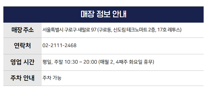 * 주소 : 서울특별시 구로구 새말로 97 (구로동, 신도림 테크노마트 2층 17호 레투스)