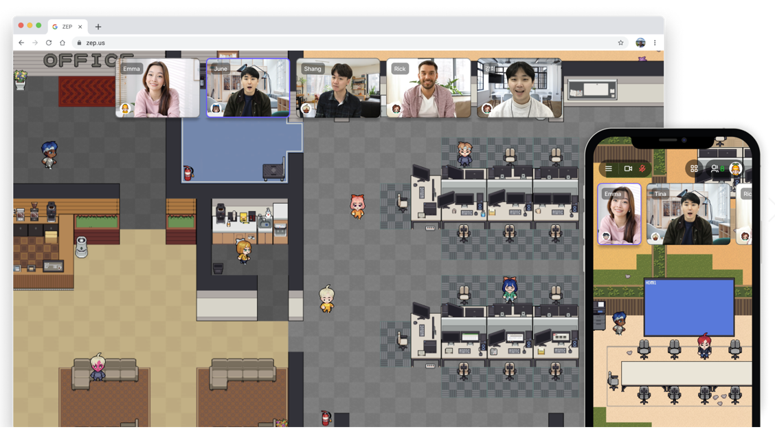 위 사진처럼 자신의 아바타를 기반으로 ZEP 공간 내에서 가상오피스를 구축하는 사례도 증가하고 있다고 합니다. 아바타를 이용해 가상 오피스에서 이동하고, 회의실에서는 실제 캠을 사용하여 실시간으로 회의도 가능해요. 팬데믹에서 엔데믹 시기로 넘어오며 활성화된 비대면, 하이브리드 근무 환경에서 유용하게 사용할 수 있습니다.
