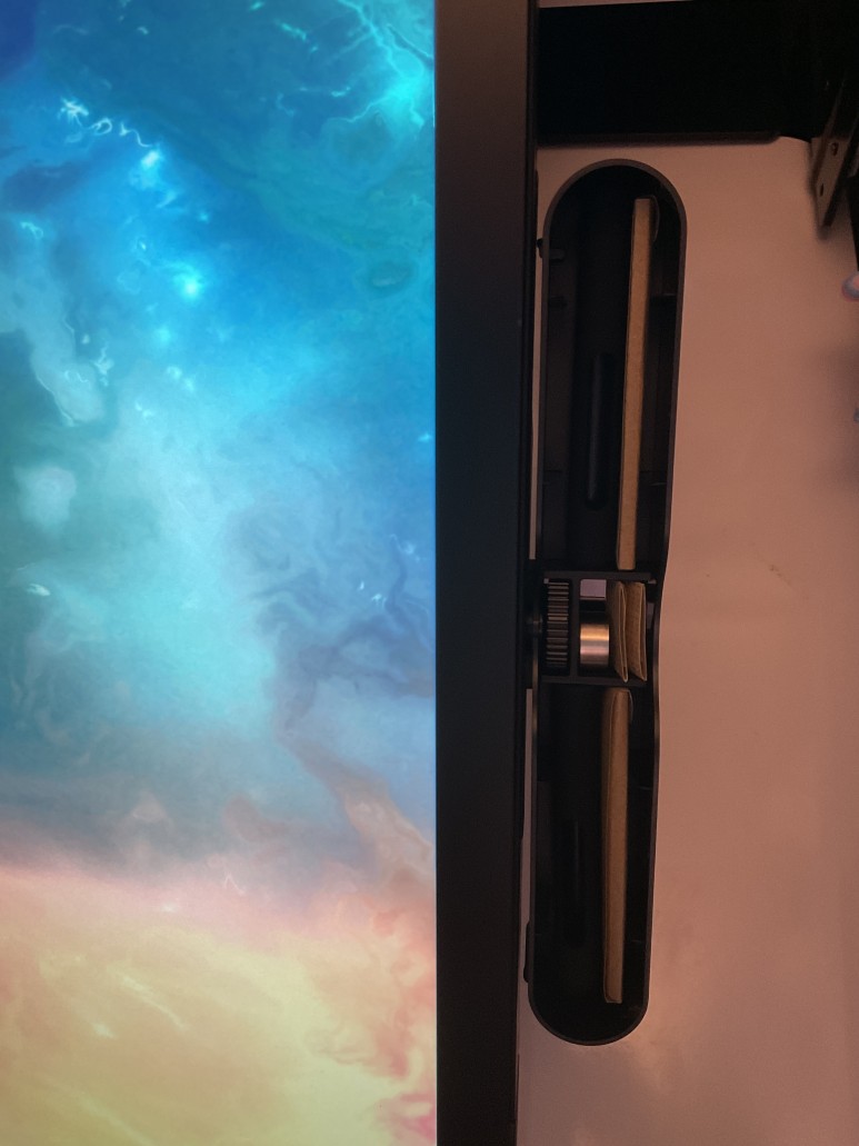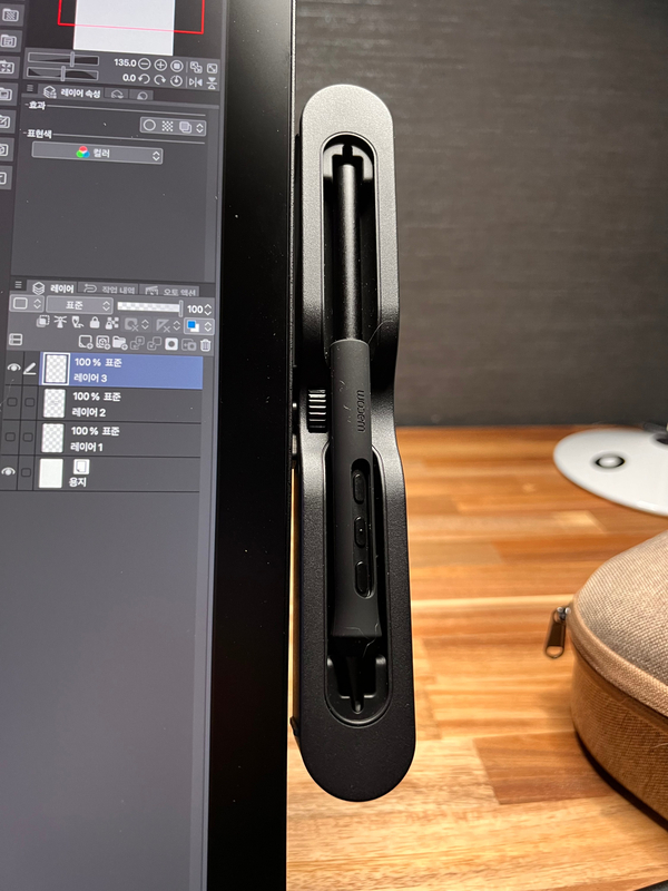 그리고 엘님의 마음에 들었던 또 다른 부분은 바로 펜 보관함입니다. 타블렛에 있는 스크류 홀에 연결해서 부착할 수 있어 편한 거치대지요. 실제로 보기 전까지는 실용성이 떨어지고 작업할 때 거슬리는 거치대일 것이라고 생각했지만, 깔끔한 외관과 더불어 작업할 때 거슬리지 않아서 마음에 들었다고 합니다. 특히 엘님은 펜의 위치를 종종 잊어버릴 때가 있는데, 펜 보관함을 사용한 후로는 사라진 펜을 찾기 위해서 시간과 체력을 허비하는 일이 완전히 사라졌다고 해요. 또, 와콤 프로 펜 3 보관함은 뚜껑을 열어서 내부에 펜 부품을 보관할 수 있는데, 펜심 역시 더 이상 잃어버릴 일이 없답니다.