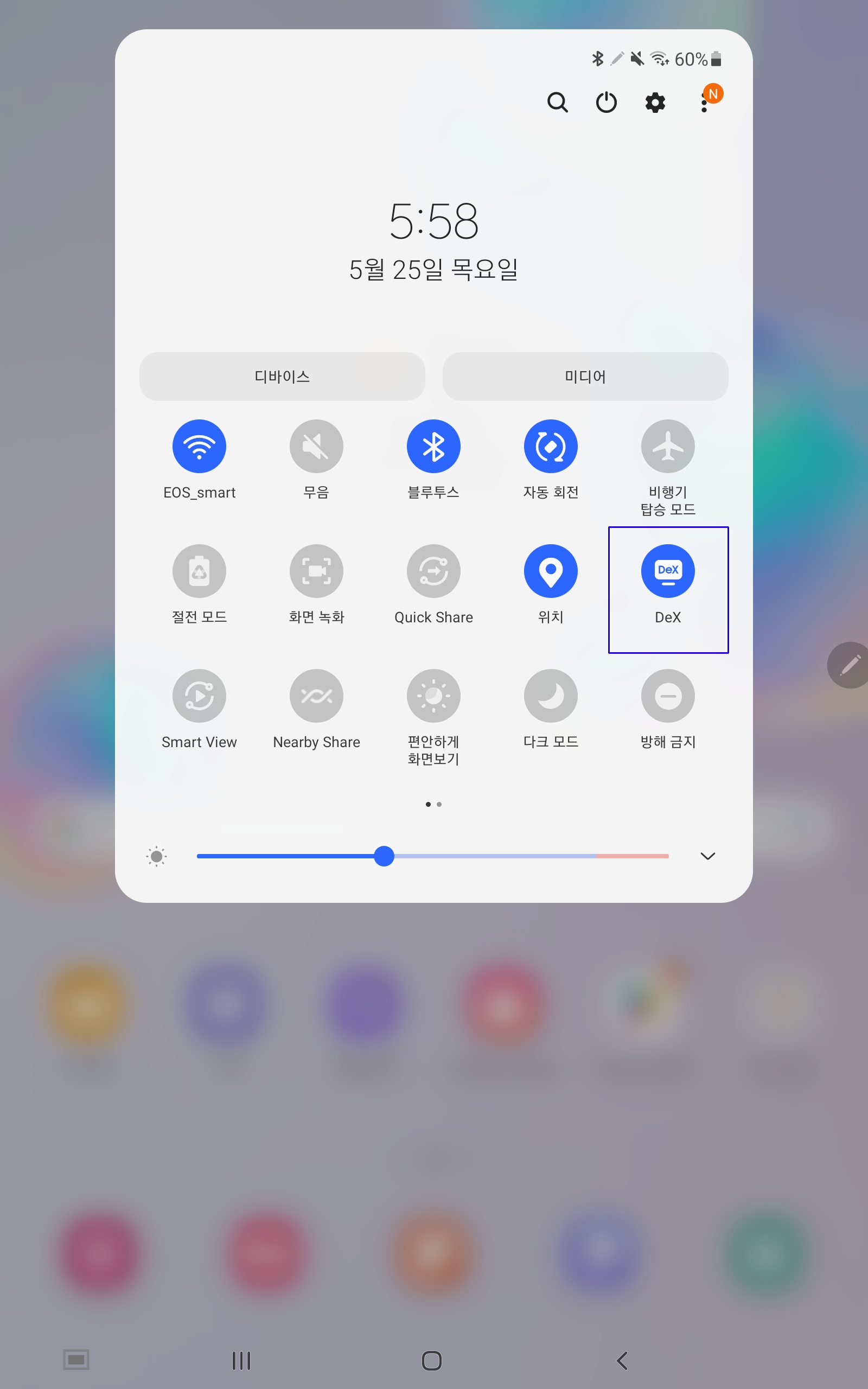 허브에 달려있는 USB-C 케이블을 갤럭시탭에 꽂아준 후, 삼성 DeX 모드를 켜주세요. 삼성 DeX 모드는 갤럭시탭과 와콤 원을 연결하면 자동으로 안내되지만, 해당 팝업이 뜨지 않는 경우에는 상단바를 내려서 확인 가능합니다. 일부 갤럭시 제품은 DeX 모드를 제공하지 않으니, 사용 전 확인해 주세요.