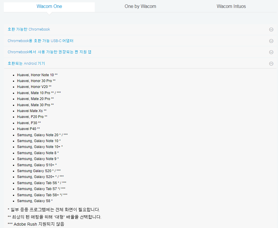 갤럭시탭과 와콤 타블렛을 사용하기 앞서, 본인의 기기가 연결 가능한 제품인지 반드시 호환 리스트를 확인해 주세요. 상단의 이미지는 와콤 원 호환 리스트로, 안드로이드 기기 중에서 와콤 원과 연결 가능한 기기가 정리되어 있습니다.