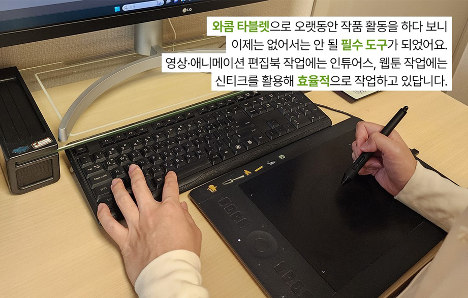 그래서 저희 작업실에는 인튜어스가 연결된 PC, 신티크 22가 연결된 PC 그리고 박지영 작가가 사용 중인 신티크 프로 24가 연결된 PC까지 해서 총 3대의 컴퓨터가 돌아가고 있어요. 요즘은 아이패드나 갤럭시 탭, 갤럭시 북 플렉스 등과 연결해서 작업하시는 분들도 많은데요. 개인적으로 이 모든 장비들을 구입해 보고 실제 작업도 해본 결과, 제일 편한 건 역시나 인튜어스였습니다. 목 통증이 제일 적기도 하고 작업 자세가 가장 자유롭기 때문이에요. 개인적으로는 자신의 건강을 위해서는 인튜어스와 신티크를 모두 활용하시는 걸 추천해 드립니다.