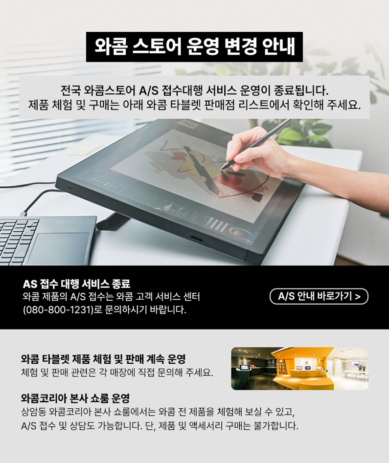 | 와콤코리아 본사 쇼룸 | 서울시 마포구 월드컵북로 402 LG상암IT센터 12층 | 080-800-1231 |